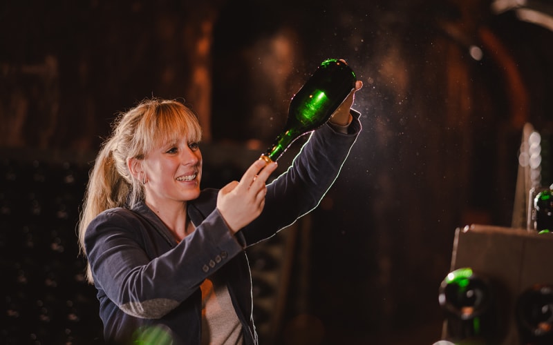 - Nach der Reifezeit kommen die Flaschen in Rüttelpulte, wo sie systematisch gedreht und von Hand gerüttelt werden, um den Hefesatz zu lösen. Das sorgt dafür, dass der Sekt klar und frei von Trübstoffen bleibt.