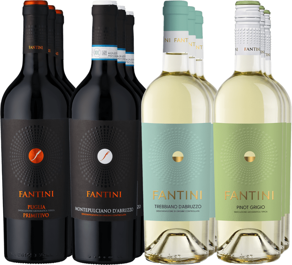Der Fantini Primitivo ist ein faszinierender Wein, der die Sinne verführt und die Essenz Apuliens in jeder Flasche einfängt. Er verführt mit reifen roten Fruchtaromen wie saftigen Kirschen, schwarzen Beeren und zarten Pflaumen. Der Fantini Montepulciano d'Abruzzo überzeugt mit intensivem Rubinrot und einer verlockenden Nase von reifen roten Kirschen und schwarzen Johannisbeeren. Hinzu kommen zwei Weißweine von Fantini. 92 Punkte verleiht Luca Maroni für den Fantini Trebbiano d'Abruzzo. Im Herzen Italiens kann die Trebbiano Traube perfekt reifen um sich später mit Noten von Pfirsich und Orangenblüten zu präsentieren. Der Fantini Pinot Grigio ist frisch und unbeschwert – ein guter Alltagswein.