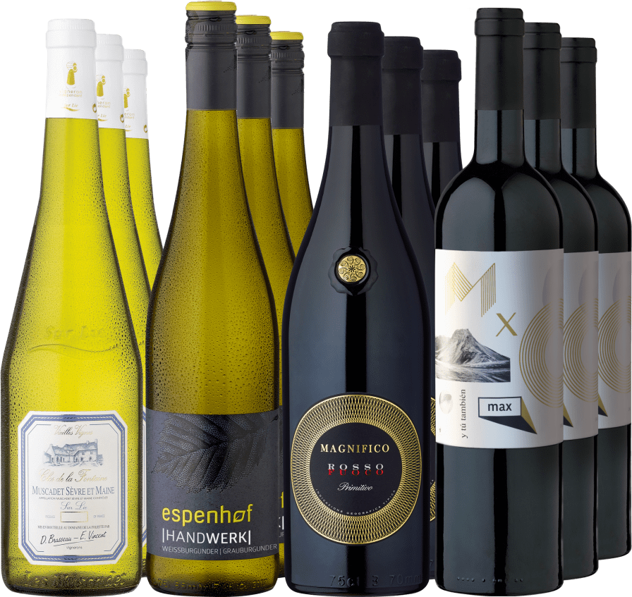 Die Weißweine liefern Frankreich und Deutschland: Der frisch-filigrane Clos de la Fontaine Muscadet sowie der fruchtig-feine Espenhof »Handwerk« Weißburgunder/Grauburgunder sind zu pikanten Suppen, leichten Fischgerichten oder auch als knackiger Schluck vor dem Essen wie gemacht. Später am Abend oder zu kräftigeren Speisen mit Fleisch und rotem Gemüse brillieren der samtige Magnifico Fuoco Primitivo aus Süditalien und der würzige Tinedo Max Bio aus der spanischen La Mancha.