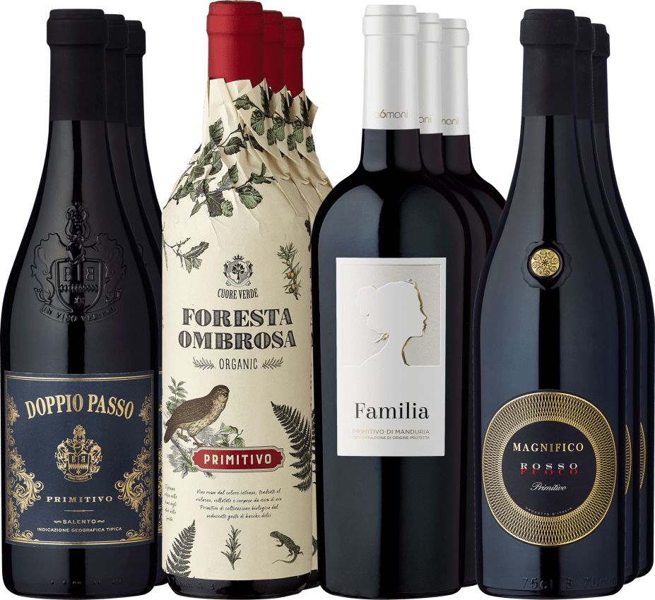 Primitivo – die Traube mit dem einprägsamen Namen liegt voll im Trend. Primitiv ist sie übrigens nicht. Aber dazu gleich mehr. Erstmal: In diesem Probierpaket erwarten Sie vier vollmundige Varianten der Rebsorte, von denen Sie auf einen Schlag je drei Flaschen erhalten. Abwechslung und Nachschub sind also garantiert. Und Ihr Geldbeutel freut sich auch. Denn satte 32 Prozent Rabatt gibt’s on top!