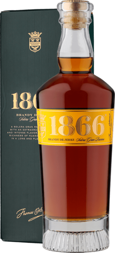 Die Herstellung des 1866 beginnt bei der sorgfältigen Auswahl der optimalen Trauben, die nach einer handwerklichen Methode in kupfernen Alquitaras in der firmeneigenen Destillerie Tomelloso destilliert werden. Im Durchschnitt reift der Brandy 1866 12 Jahre lang in Osborne-Sherry-Fässern. Während dieser Zeit durchläuft er 16 Stufen des Criadera- und Solera-Verfahrens, eine einzigartige Anzahl. Das Ergebnis ist, dass der Brandy 1866 eine unvergleichliche Komplexität von Aromen und Geschmacksrichtungen erreicht.