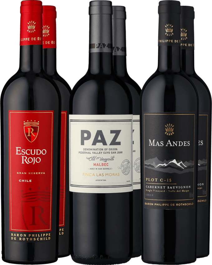 Die Escudo Rojo Gran Reserva ist eine echte Legende. Sie stammt aus der chilenischen Top-Region Valle Central und vereint fünf edle Trauben zu einer kraftvollen Rotwein-Cuvée mit tiefer Frucht und feiner Würze. Sie ist eines der Flaggschiffe aus dem Imperium von Baron Philippe de Rothschild – genau wie die Mas Andes Gran Reserva. Dieser Spitzenrotwein wird reinsortig aus Cabernet Sauvignon gekeltert. Durch eine lange Reife im Holzfass schmeckt er sagenhaft komplex und ausgewogen.Auf der anderen Seite der Anden entsteht mit dem Finca Las Moras PAZ Malbec ein argentinischer Premium-Malbec. In der Vorzeigeregion Mendoza reifen die Trauben unter Idealbedingungen und entwickeln eine tiefe, frische Frucht. Begleitet von seidigen Tanninen transportiert dieser fassgereifte Malbec die intensiven Aromen eins zu eins ins Glas.