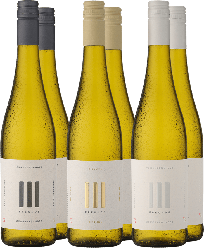 Was erwartet Sie also genau im Paket? Der III Freunde Grauburgunder punktet mit einem dichten Charakter, cremigem Schmelz und Aromen von heimischem Streuobst. Fans klarer, geradliniger Weißweine mit zurückhaltender Säure sind hingegen mit dem III Freunde Weißburgunder bestens bedient. Und auch die Königin der Rebsorten darf in diesem Paket auf keinen Fall fehlen. Mit seiner rebsortentypischen Frucht und der Harmonie aus Süße und Säure beschert der III Freunde Riesling Freude pur.
