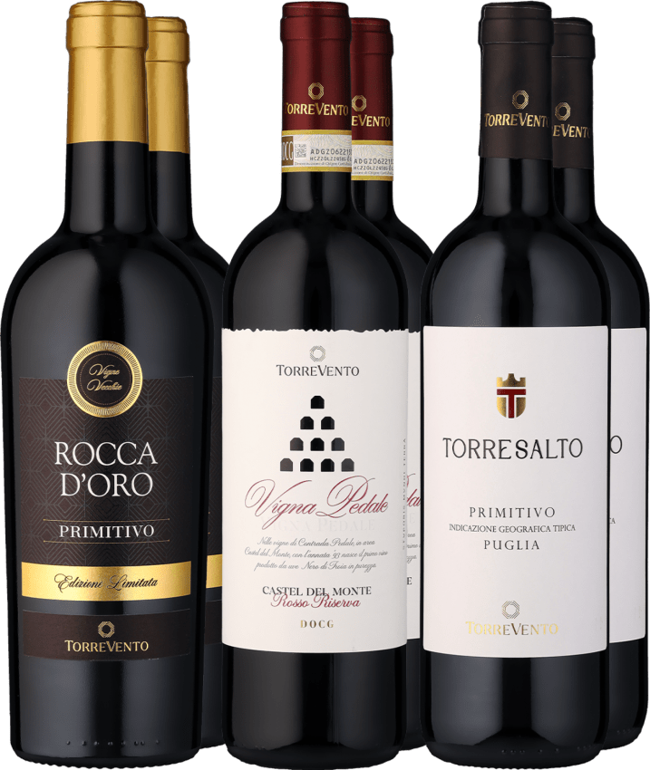 Zwei Primitivo-Charaktere – Rocca d'Oro und Torre Salto – präsentieren sich fruchtbetont, weich und vollmundig, jedoch mit jeweils eigener Nuance. Der eine etwas würziger, der andere etwas eleganter. Dazu kommt der Vigna Pedale Castel del Monte Riserva – ein DOCG-ausgezeichneter Wein, der mit seiner Tiefe und Reife wahre Klasse zeigt. Ob zum festlichen Sonntagsbraten, zur Pasta mit kräftiger Tomatensauce oder beim Kaminabend mit Freunden, diese Weine begleiten Ihre besonderen Genussmomente stilsicher und souverän.