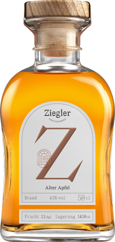 Die Ziegler Alter Apfel ist ein Obstbrand mit Klasse und Charakter – gemacht aus den besten Äpfeln, die Deutschlands Obstgärten zu bieten haben. Die Kombination aus Gravensteiner, Cox Orange und Elstar sorgt für ein faszinierend vielschichtiges Aromenspiel. Für eine 0,5-Liter-Flasche werden etwa 11 Kilogramm dieser exquisiten Früchte verarbeitet, und das schmeckt man mit jedem Schluck. Reifung in Eichen- und Kastanienfässern gibt dem Brand seine goldene Farbe und eine edle Tiefe.
