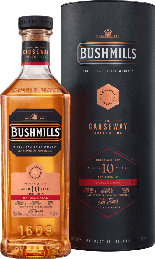 Die Bushmills »Causeway Collection 2024« bereichert wieder mit einem exklusiven Highlight den deutschen Whiskey-Markt: dem Bushmills »Causeway Collection« Barolo Cask 10 Years Old. Dieser limitierte Single Malt lädt gemeinsam mit dem eigens entwickelten »Whiskey Wind-Down« zu einem einzigartigen Genusserlebnis ein, das die Sinne verführt und die Welt des Whiskeys auf besondere Weise erfahrbar macht. Der geführte Tasting-Track, der unter www.thecausewaycollection.com verfügbar ist, begleitet Genießer durch die Verkostung und vermittelt spannende Einblicke in die irische Whiskey-Tradition und die Marke Bushmills.Die 10-jährige Reifung in ausgewählten Oloroso-Sherry- und Bourbon-Fässern, gefolgt von einem dreijährigen Finishing in seltenen Barolo-Fässern aus der Piemont-Region, verleiht diesem Whiskey ein unverwechselbares Geschmacksprofil. Das Resultat ist ein reichhaltiger Single Malt, der durch seine rubinrote Mahagonifarbe und die intensiven Aromen von roten Früchten, Honig und gerösteten Gewürzen besticht. Die Nase wird von feinen Noten von Vanille und Haselnuss umschmeichelt, während am Gaumen Schokolade, Rosenblätter und Himbeeren ein harmonisches Zusammenspiel bieten.