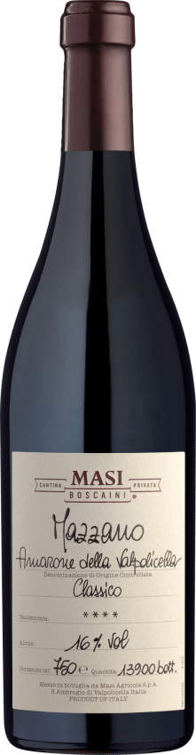 Der Masi Mazzano ist ein starker und majestätischer Amarone della Valpolicella. Benannt ist dieser Rotwein nach der Lage Mazzano. Sie verleiht ihm seinen einzigartigen und unverkennbaren Stil. Zu verdanken ist dies der idealen Ausrichtung und Höhe der Weinberge (350 bis 415 Meter über dem Meeresspiegel). Die Rebstöcke der Sorten Corvina, Rondinella und Molinara wachsen auf bröckeligem, kalkigem, aber humusreichen Untergrund. Durch diese Begebenheiten und die äußerst sorgfältige Durchführung des Appassimento-Verfahrens erhält der Wein seine großartige Persönlichkeit. Dafür werden die Trauben nach der Ernte auf Regalen luftgetrocknet, sodass deren Inhaltsstoffe sich immer mehr konzentrieren. Sie werden erst maischevergoren, wenn die Beeren fast zu Rosinen geworden sind.