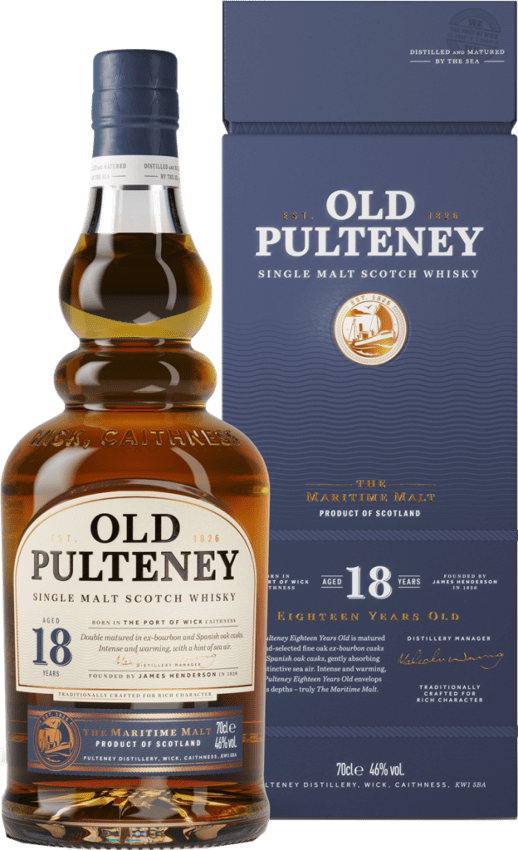 Der »Old Pulteney 18 Years« ist ein Single Malt Whisky der Spitzenklasse. Er stammt vom nördlichsten Zipfel des schottischen Festlandes aus dem Hause der Old Pulteney Distillerie. Ein Standort mit Vorzügen: Schon seit 1826 profitieren die Erzeugnisse der Brennerei von der unmittelbaren Nähe zum Meer, denn die salzige Meerluft findet sich geschmacklich in den Whiskys wieder.