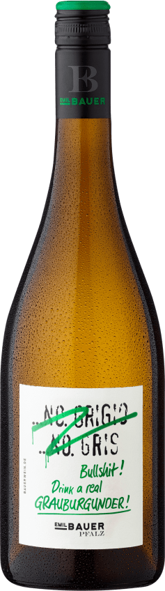 Für die Rebsorte Grauburgunder gibt es viele Synonyme und Bezeichnungen in anderen Sprachen. Sei es Pinot Grigio, Pinot Gris oder die alte Bezeichnung Ruländer. Mit dem »Pinot Grigio, Pinot Gris -Bullshit, drink a real Grauburgunder« setzt das Weingut Emil Bauer ein weiteres klares Statement und zeigt, dass dies alles "Bullshit" ist und dass ein wahrer Pfälzer Grauburgunder probiert werden sollte.
