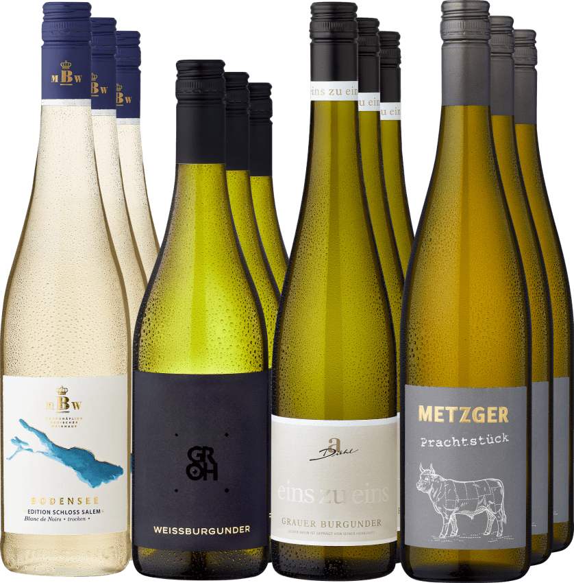 Schnuppern, schmecken und staunen: Die ganze Klasse der Burgundersorten erwartet Sie in einem Paket. Genießen Sie einen feinen Blanc de Noirs aus Spätburgunder, einen kräftigen Pfälzer Grauburgunder sowie einen vibrierend frischen Weißburgunder aus Rheinhessen. Außerdem dabei: das weiße »Prachtstück« vom Metzger!